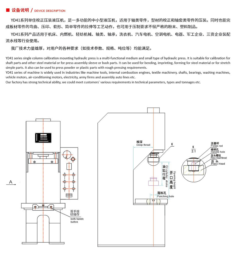 集设计、开发、生产、销售为一体的液压机械专业生产企业,主要产品有单柱液压机、液压校直机、四柱液压机、电机专用压桩机、钢板校平液压机、多功能折边机、汽车桥校正液压机、整形液压机、压力传感液压机、非标液压机等。